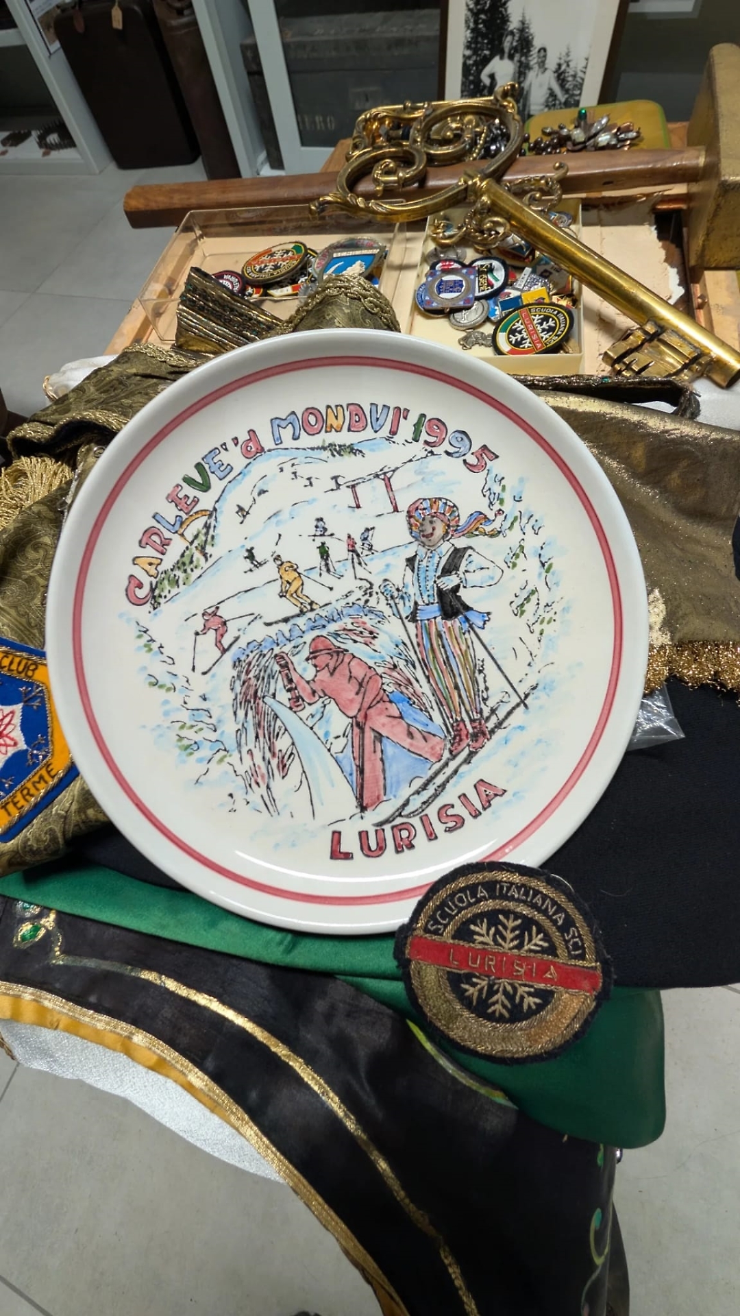 Il costume era sostanzialmente intero, compresi i finti gioielli il martello e le chiavi della città, anche se purtroppo non siamo riusciti a ritrovare i pantaloni. Lo abbiamo così completato con un paio di pantaloni di un altro costume, per completare la maschera. Però abbiamo potuto acquisire anche altri cimeli interessanti: alcune medaglie di guerra, appartenute probabilmente a suo padre Vitale Cattò, e alcuni distintivi della stazione sciistica e delle gare a cui aveva partecipato, tra cui una storica “patch” con l’atomo nel logo. Inoltre, c’è anche qualche distintivo legato al mondo del motociclismo».