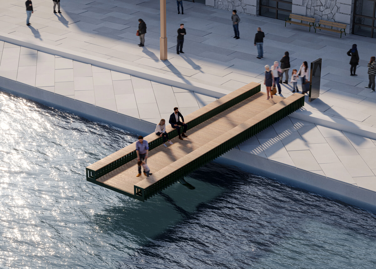 Un rendering dei battelli che viaggeranno sul Po. Nelle altre immagini, la futura darsena e l'attracco dei Murazzi