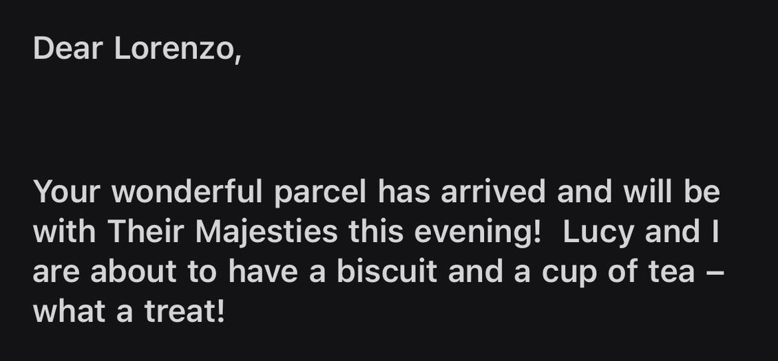 A dicembre avevamo dato notizia del viaggio di Lorenzo a Londra, nel corso del quale ha avuto modo di presentarsi a Buckingham Palace per lasciare un piccolo presente, un pacco contenente alcuni dolci, tra cui paste di meliga vicesi. Le stesse che, alcune settimane più tardi, ha inviato via posta. A questo secondo invio è riferita la mail di Belinda Kim, che ringrazia il giovane: «Il tuo splendido pacco è arrivato – scrive –e sarà consegnato alle Loro Maestà questa sera! Lucy ed io stiamo per gustarci un biscotto e una tazza di te».