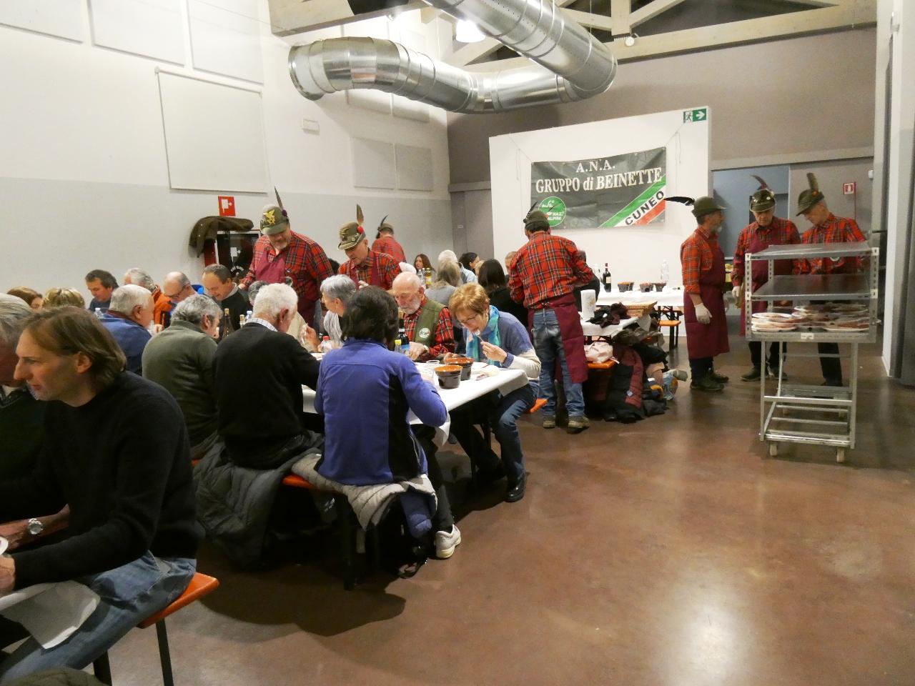 È sempre molto apprezzata la serata delle Penne nere di Beinette dedicata alla Bagna Cauda. Sabato 28 febbraio il Salone Olivetti ha proposto una cena di grande successo, con ben 150 persone che hanno partecipato per gustare il classico piemontese, con l'organizzazione e la cucina impeccabile del gruppo guidato da Ezio Giavelli, che da sempre ha fatto della propria organizzazione ed abilità ai fornelli un vanto. Come da ormai qualche anno è consuetudine, anche stavolta si è avuto occhio particolare per l'ambiente, con l'invito ai partecipanti a portare con loro posate e piatti. A fine pasto, a disposizione dei presenti, anche un ottimo servizio bar.