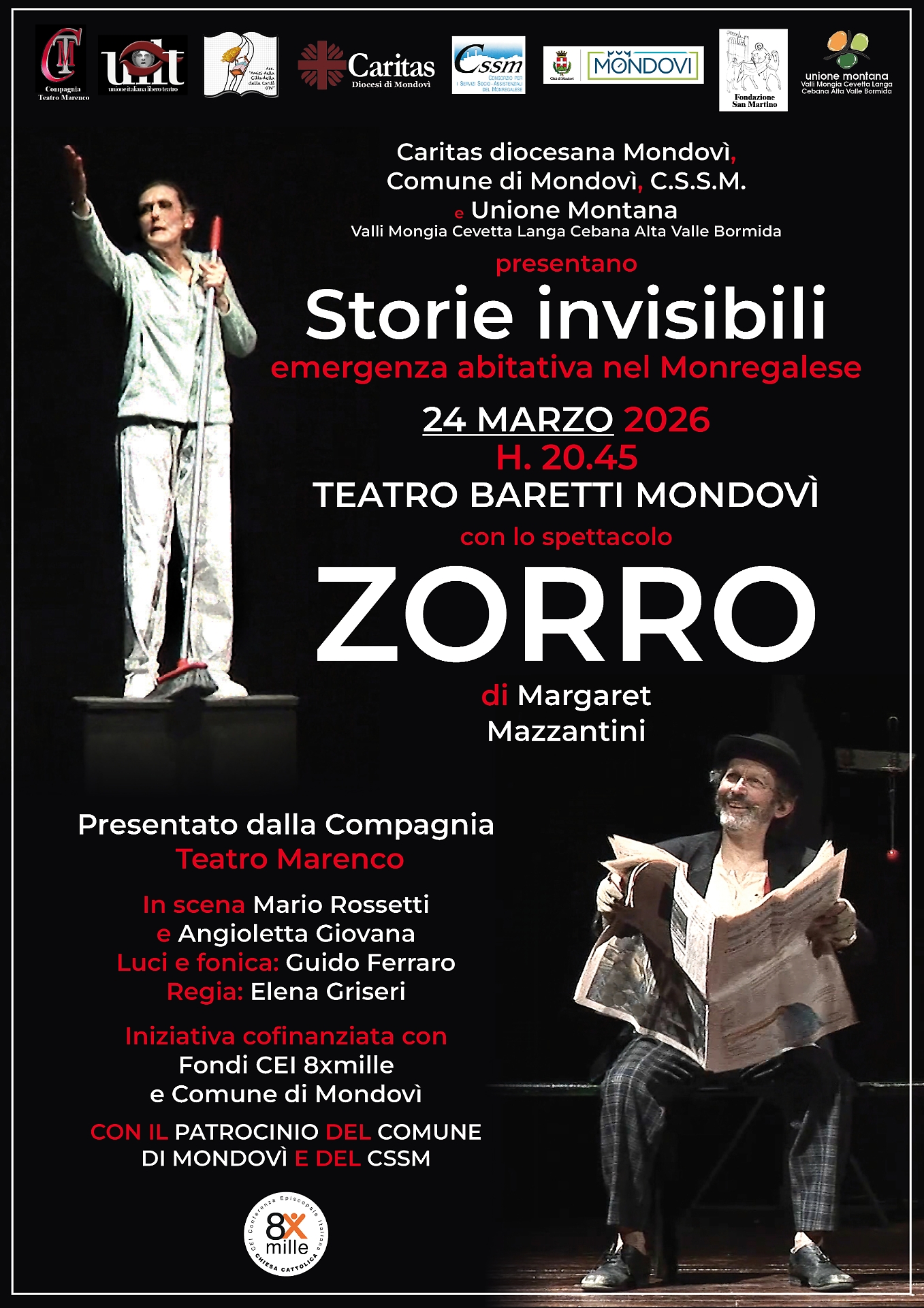Lo Spettacolo “Zorro” di Margaret Mazzantini - Storie invisibili – Emergenza abitativa nella Diocesi - Teatro Baretti di Mondovì – Martedì 24 marzo, ore 20.45