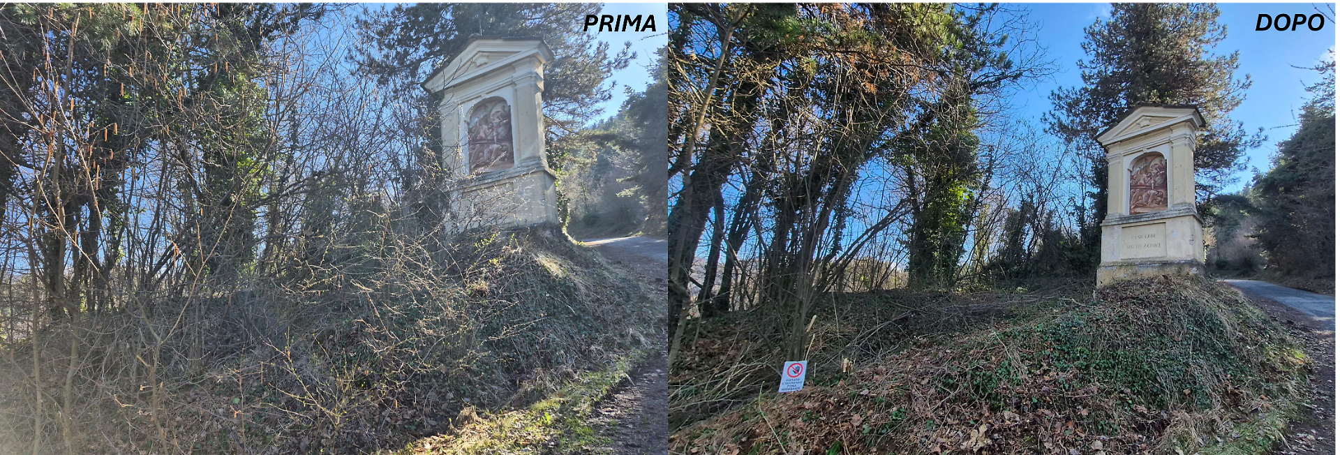 Oltre ad estirpare le erbacce e i rovi cresciuti davanti e attorno ai tre piloni, è stato anche pulito il sentiero che dalla cappella di San Bernardo porta al santuario di Santa Lucia.
