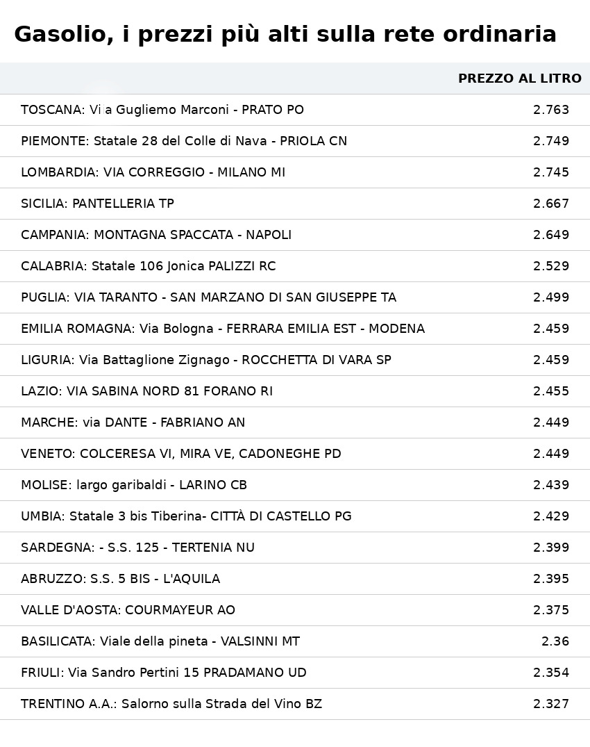 Peggio si registra solo in Toscana, dove a Prato (via Marconi) ha toccato i 2,763 euro al litro, mentre al terzo posto si piazza Milano (via Correggio) con 2,745 euro/litro.