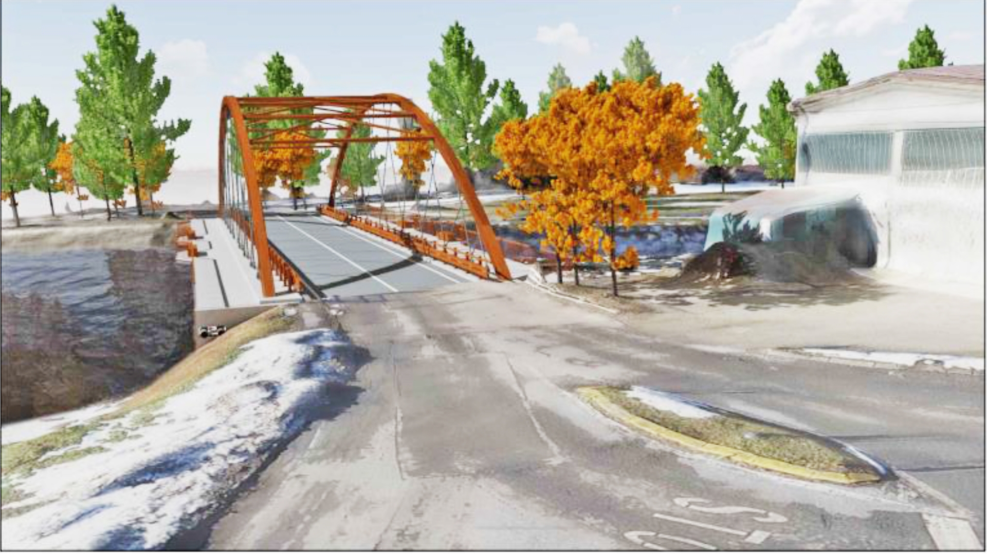 Il rendering del progetto evidenzia i due grandi archi in metallo che consentiranno al ponte, attraverso appositi “tiranti”, di superare con un’unica campata il letto del torrente.