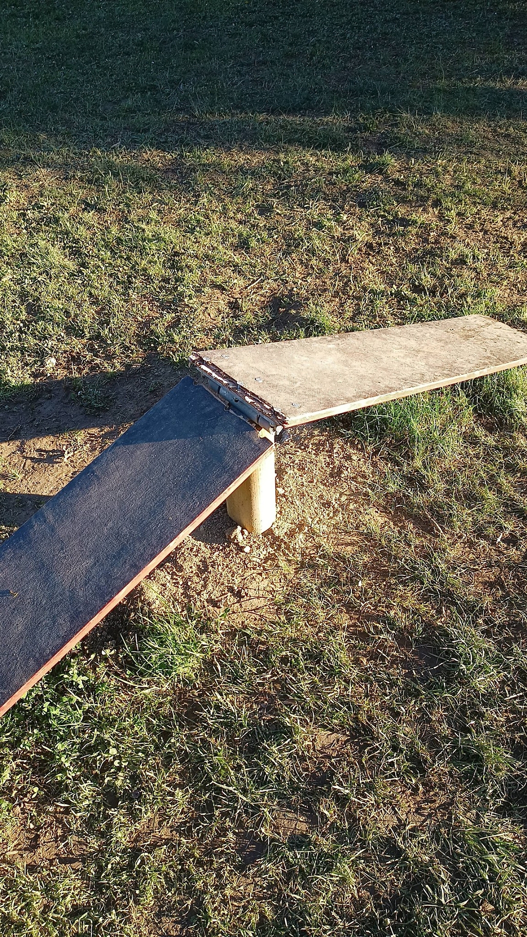 Uno degli attrezzi per le attività di agility dog, una rampa mobile che i cani potevano salire e scendere facendola inclinare durante il percorso, è spaccata in due: