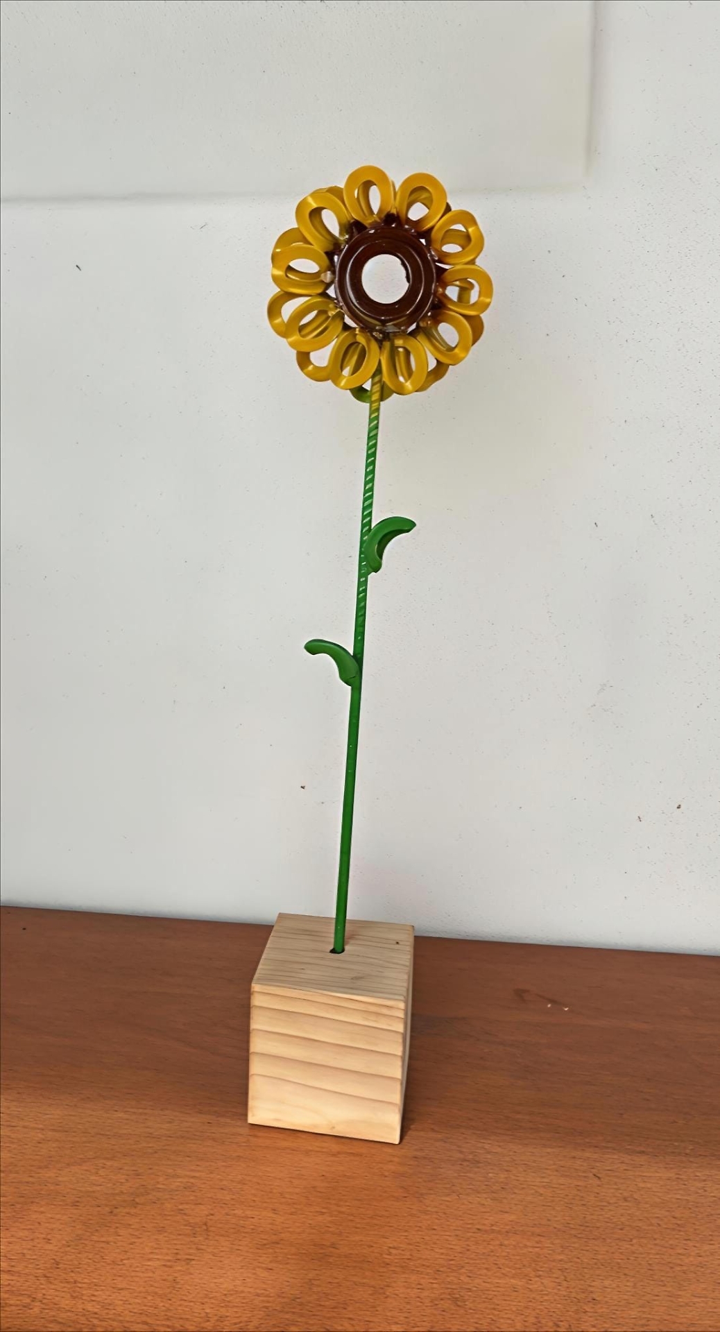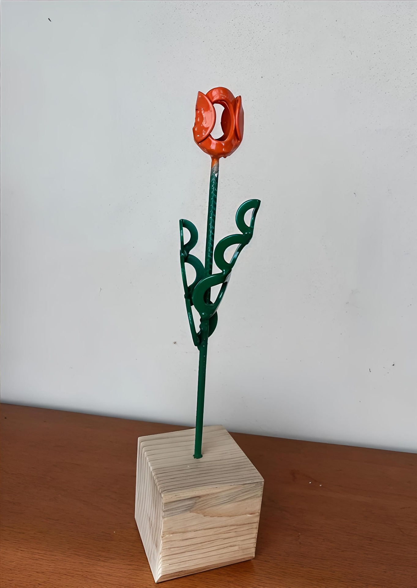 Dopo aver dato vita a un maestoso corvo imperiale e a una vivace ranocchia — realizzati con tondini, bulloni e frammenti metallici — Bertone porta ora in scena un universo più raccolto: quello dei fiori.