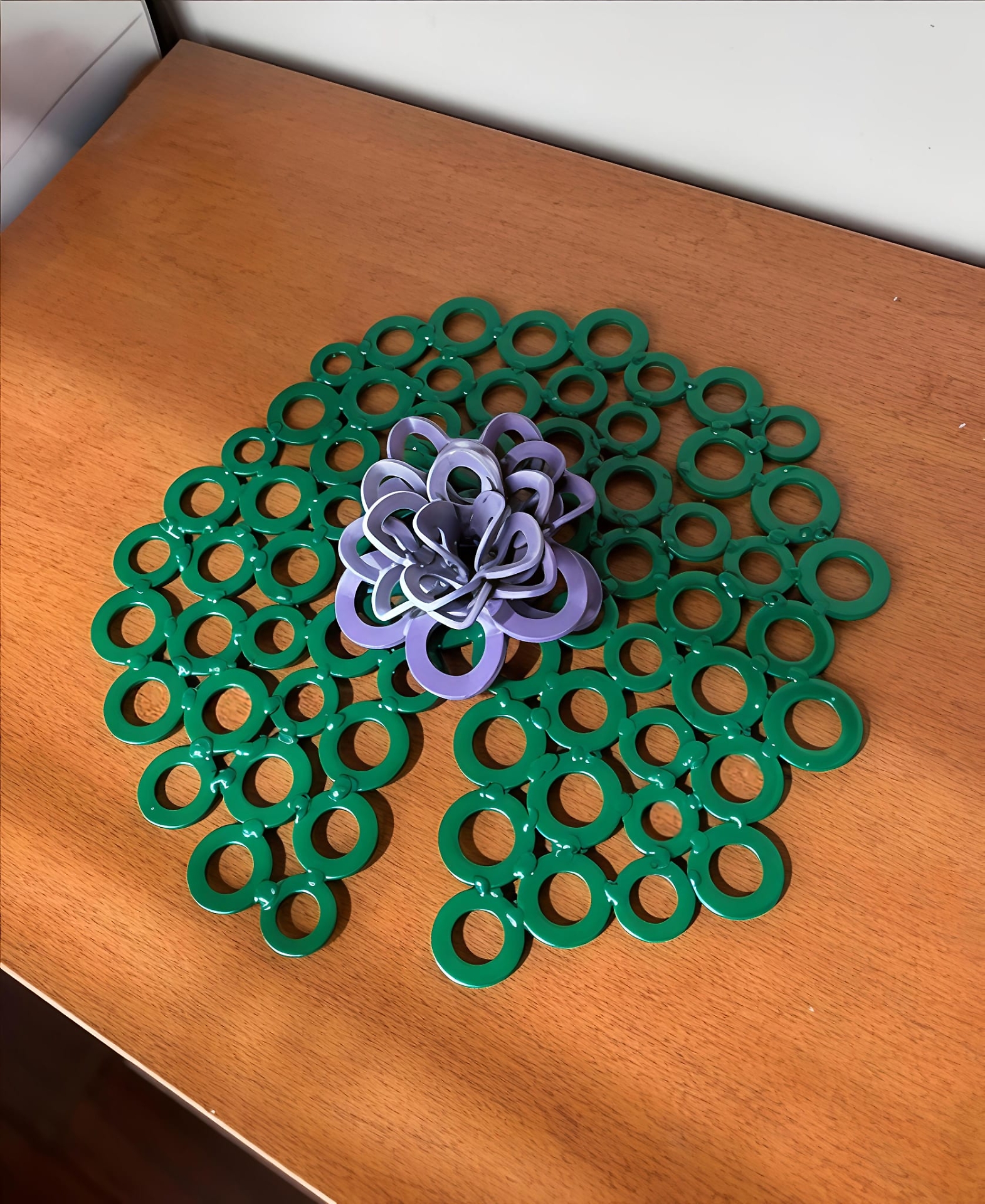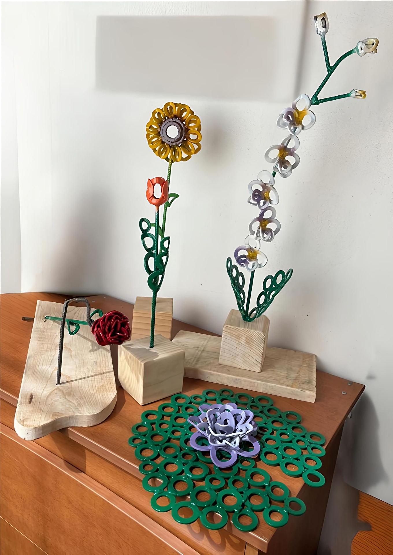 Cuore della mostra sono le rondelle di ferro, piegate e colorate fino a diventare corolle eleganti e sorprendenti. Gli steli, realizzati con tondini da costruzione, sostengono queste creazioni che sfidano la natura stessa del materiale: il ferro, duro e freddo, si trasforma in qualcosa di morbido, quasi vivo.