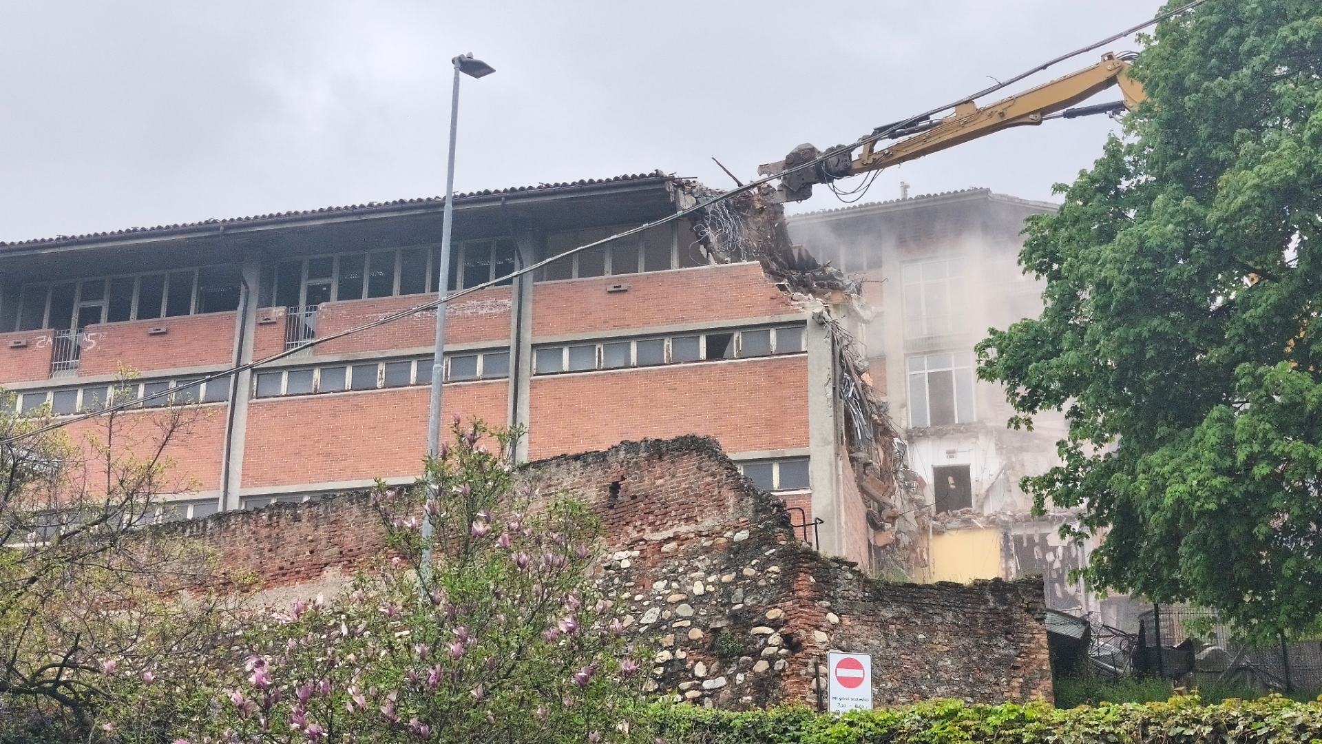 Un pezzo dopo l'altro, l'Istituto "Baruffi" viene giù. La vecchia sede, quella di via Tortora, è già senza una porzione: in un solo giorno la pinza da demolizione ha distrutto la prima manica, quella che si affacciava sui binari della funicolare.