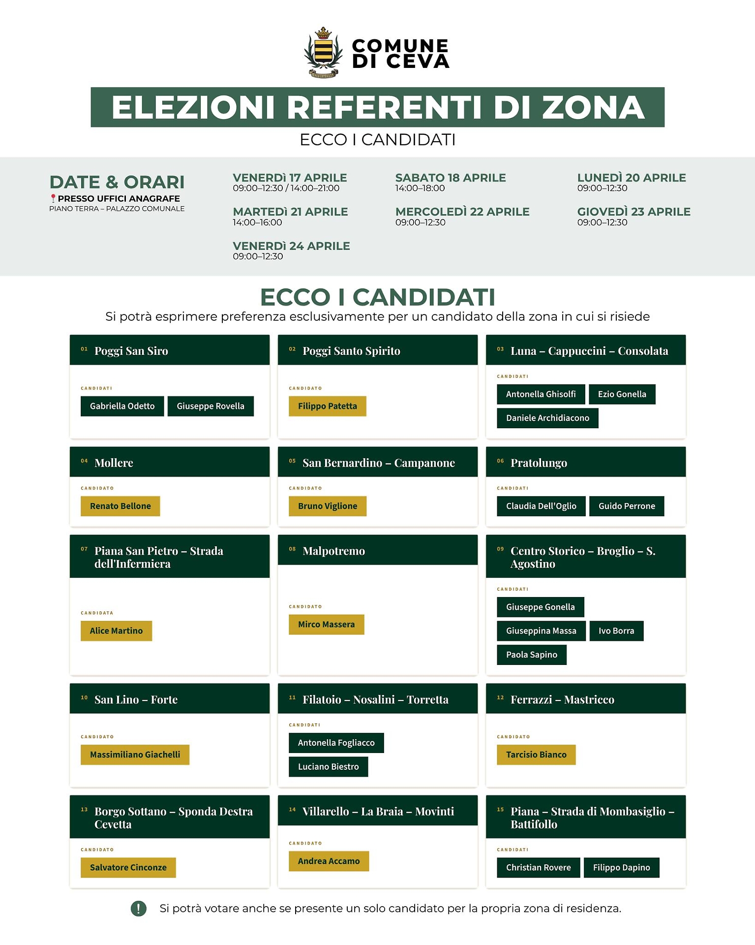 Ecco l’elenco completo dei candidati nelle quindici aree individuate sul territorio di Ceva: