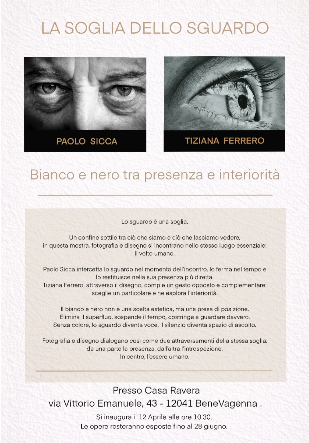 C’è un confine sottile, quasi invisibile, che separa l’apparenza esteriore dall'essenza più profonda di un individuo. È su questo crinale che si sviluppa "La soglia dello sguardo", la mostra attualmente in corso presso Casa Ravera (via Vittorio Emanuele 43, a Bene Vagienna), che vede protagonisti gli artisti Tiziana Ferrero e Paolo Emanuele Sicca.