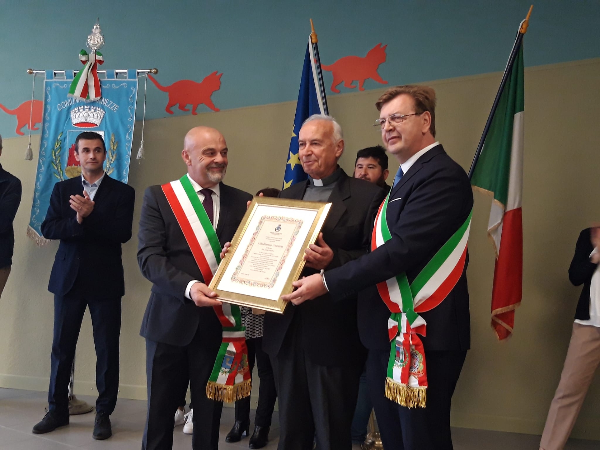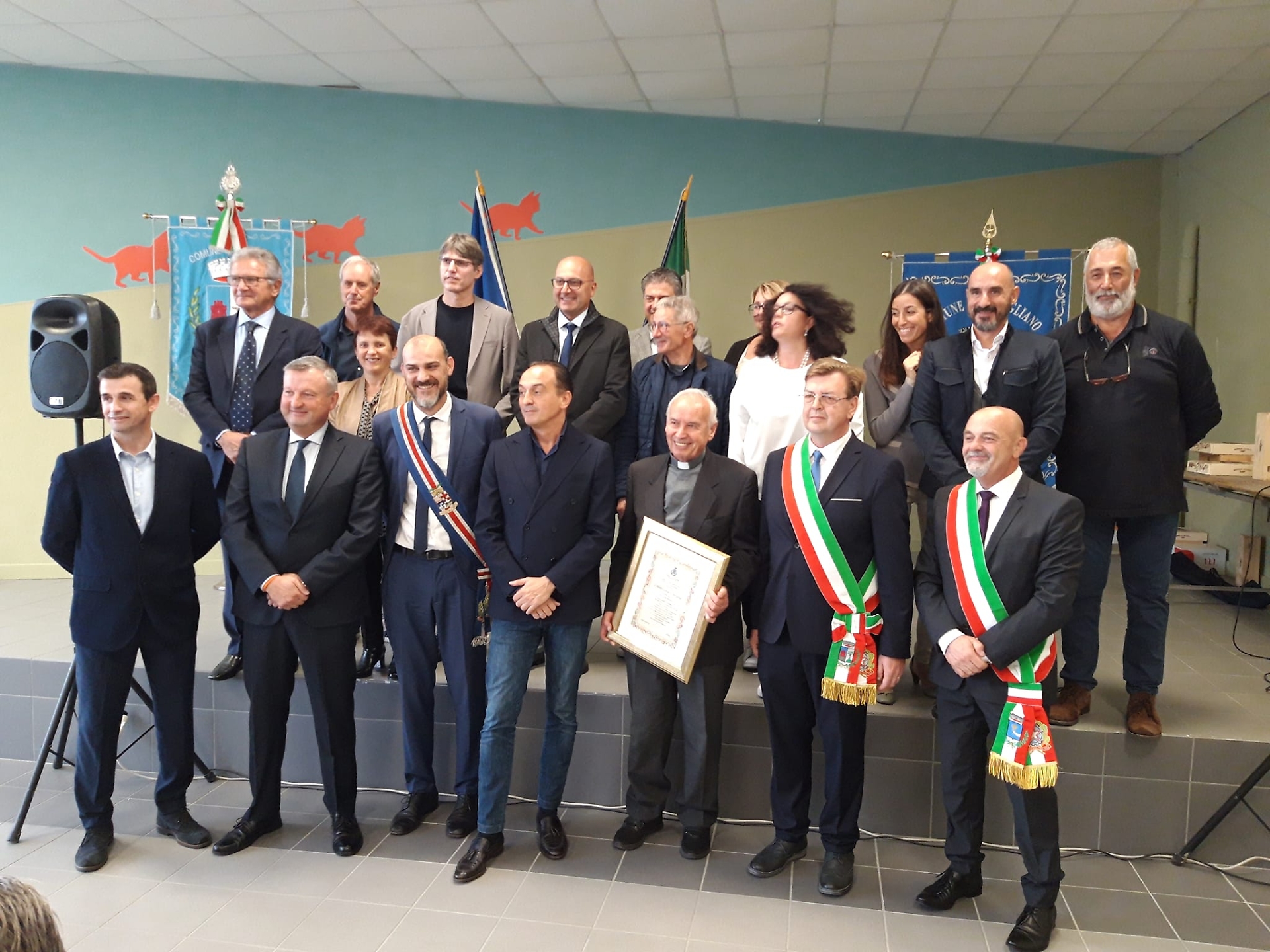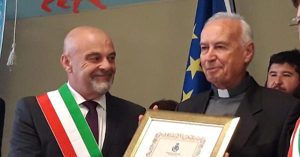 Il sindaco Ivano Airaldi e don Giorgio, durante la consegna della cittadinanza onoraria